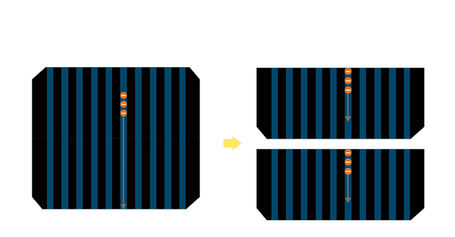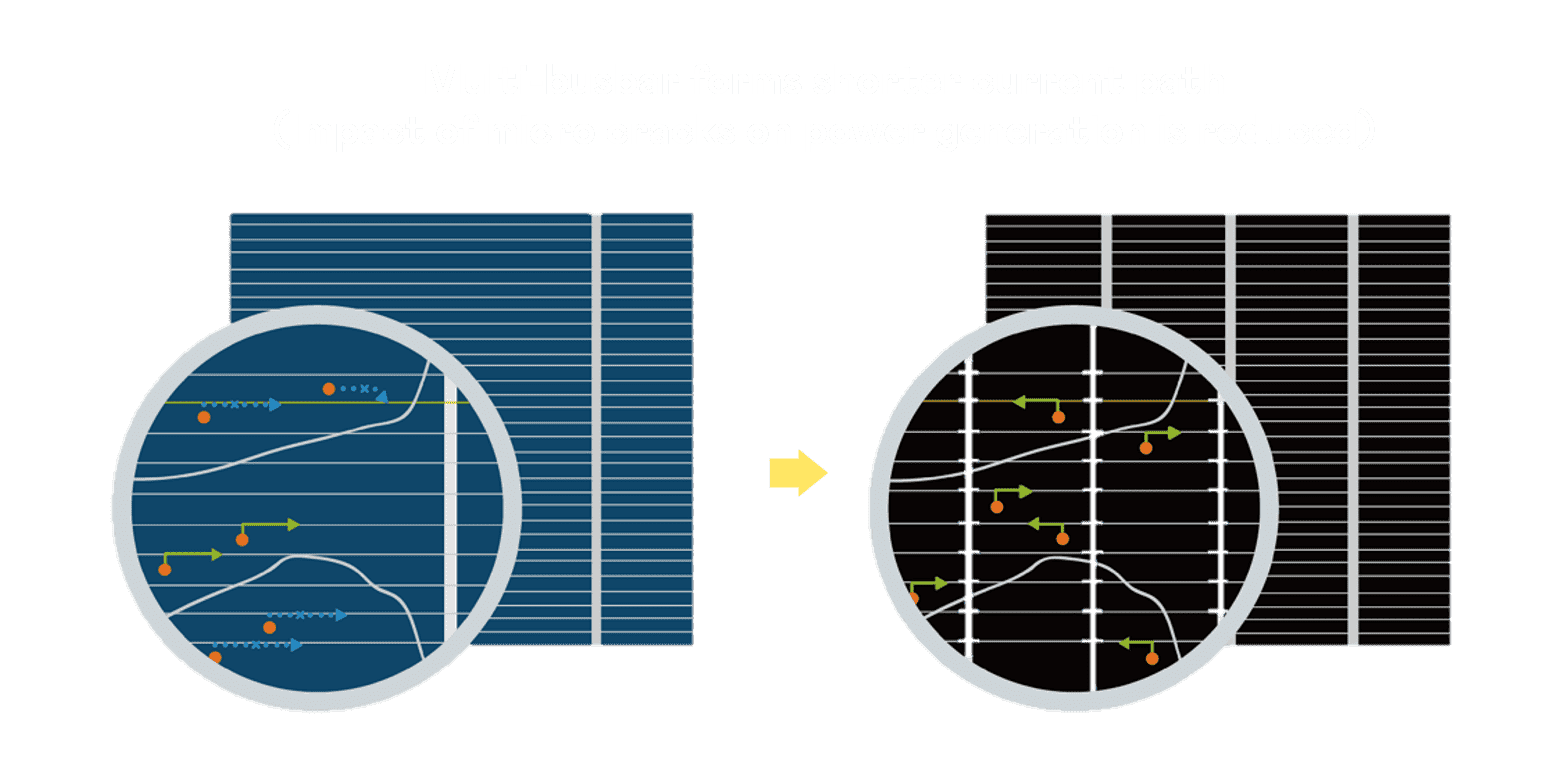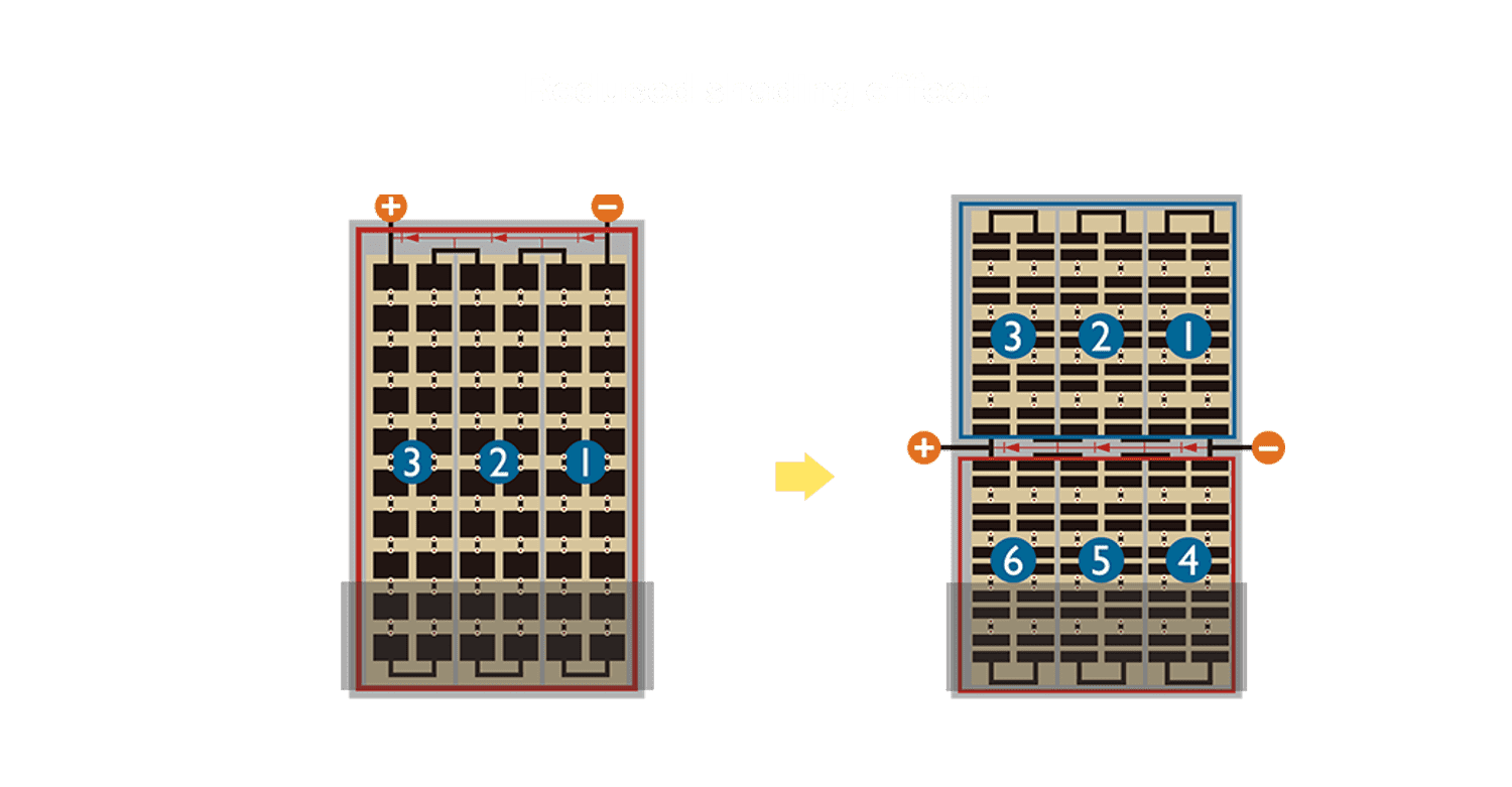 • 结合半切电池,,降低遮阴影响、、、提升模组抗隐裂能力、、、、并减少电阻损耗,,,,进一步提升模组发电效能。。。。