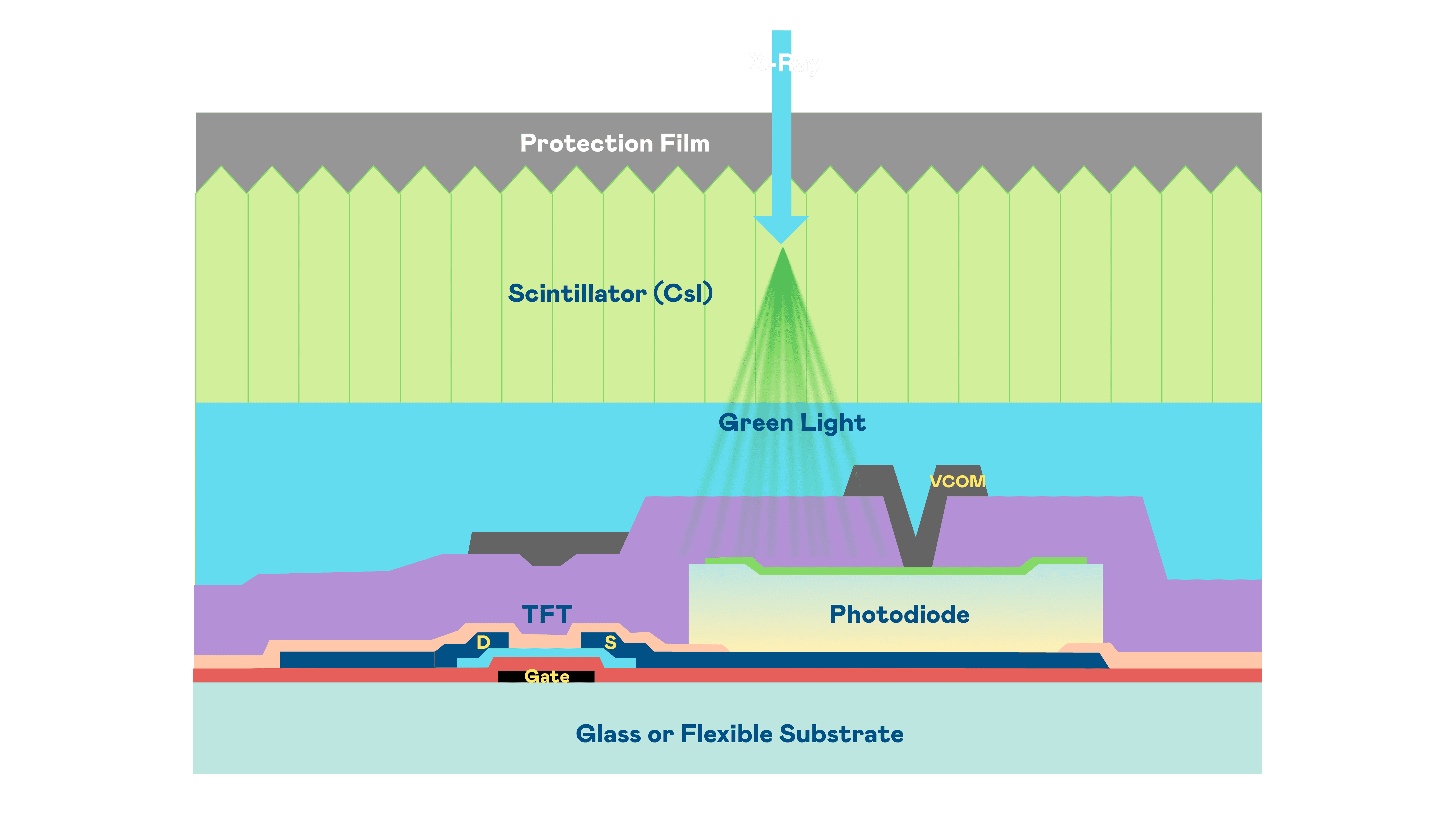 2468BET的X光影像感测阵列使用薄膜电晶体 (TFT) 作为每个像素的读取开关,,,搭配光电二极体(Photodiode)的光电转换元件,,,,用以感测X光影像讯号。。
